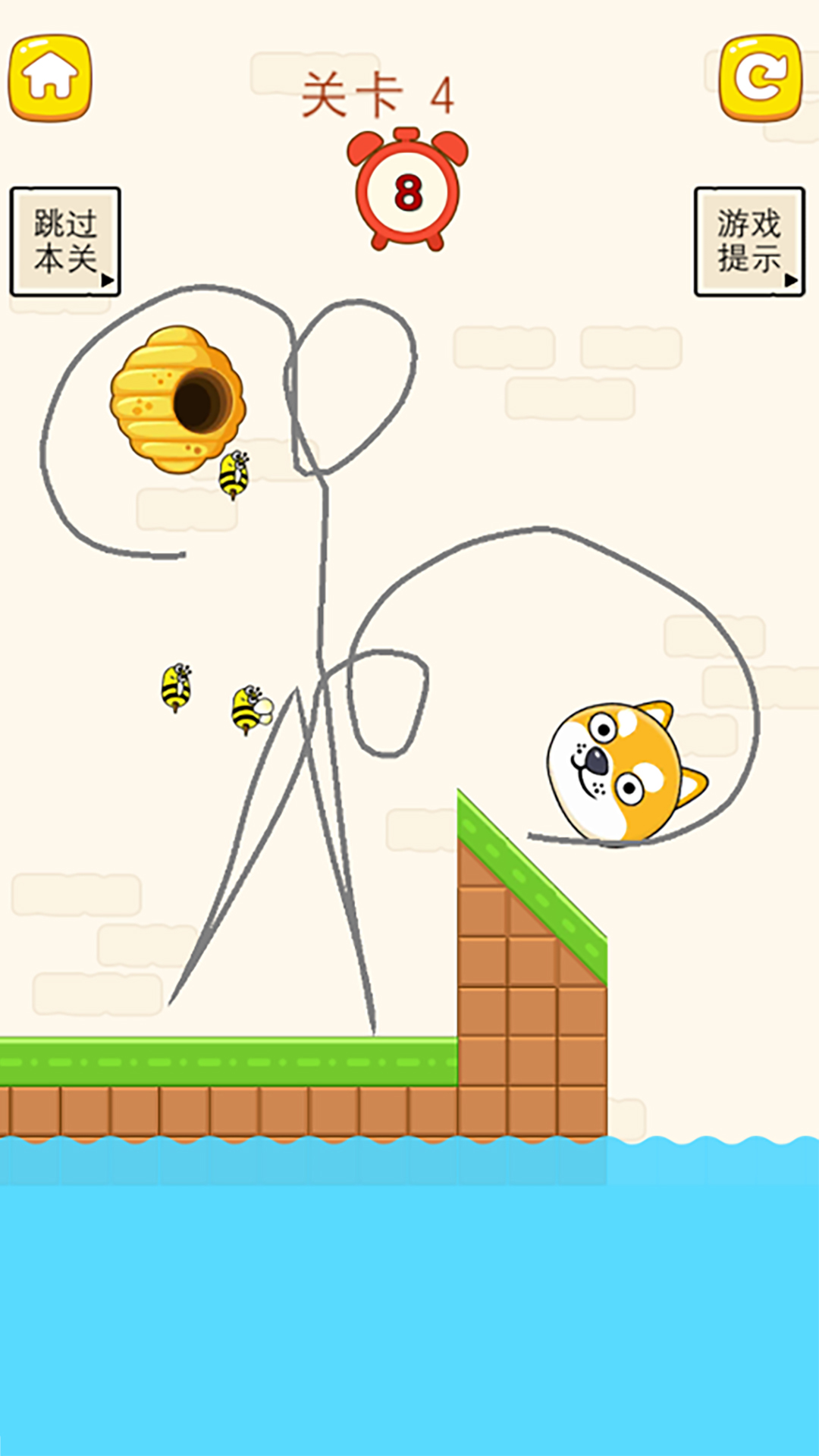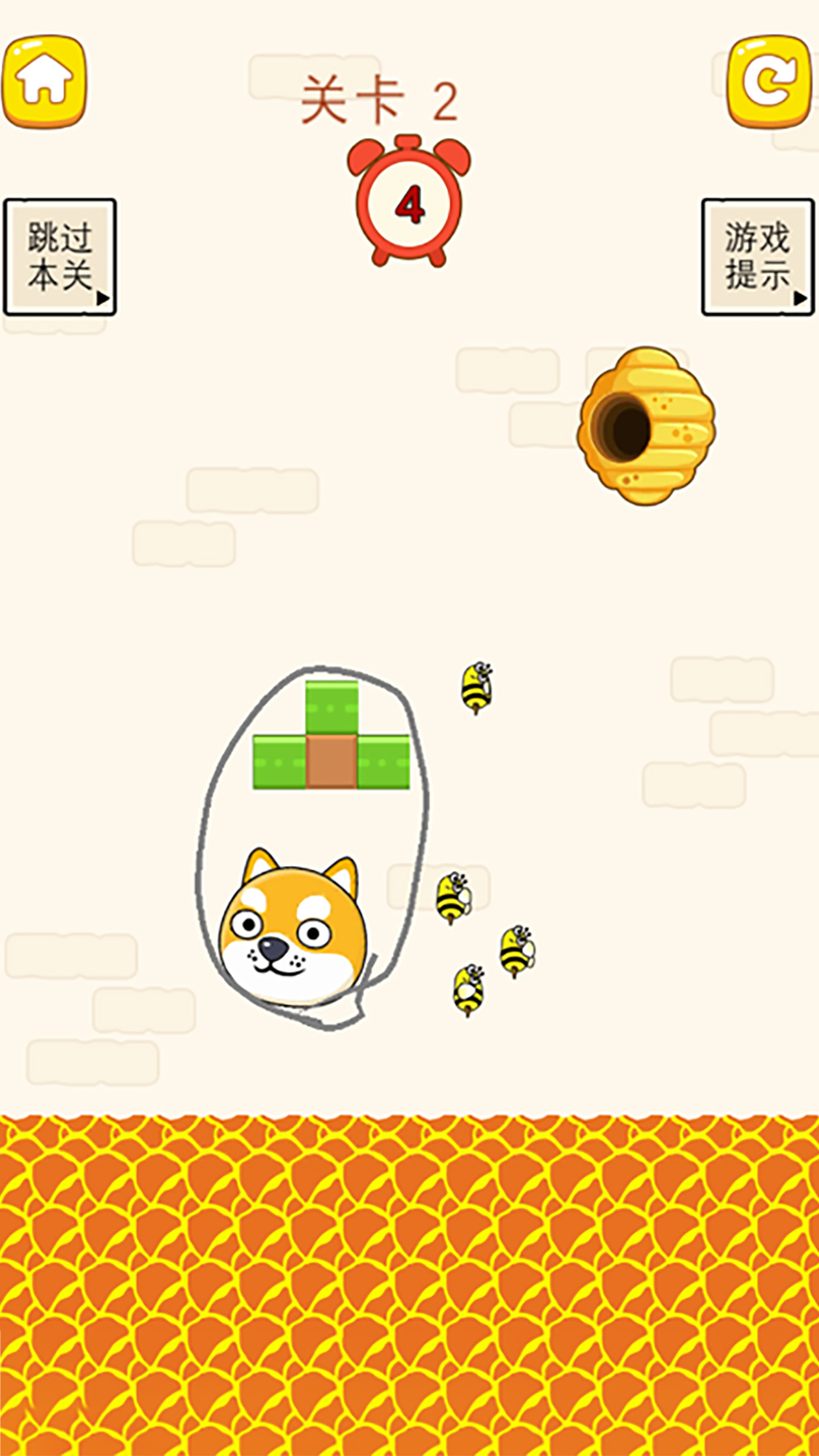 这是一个魔性的休闲益智小游戏,可以随时开启或关闭完全不耽误玩家的时间,并且内存小不占空间,简直是居家旅行魔性小游戏,会通过脑筋急转弯的玩法类型,让玩家沉浸在不同关卡的挑战之中,当然随着关卡挑战越来越难,也需要玩家不同发挥自己的灵活思维,记住保护狗狗的安全才是你的目的,千万要抵挡住凶猛的蜜蜂哦。如果没有保护好狗狗,狗狗则会被蜜蜂咬伤噢。