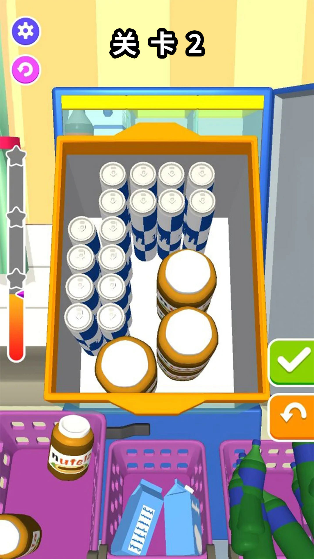 3、高度自由的整理玩法,将所有物品,都放入冰箱中。