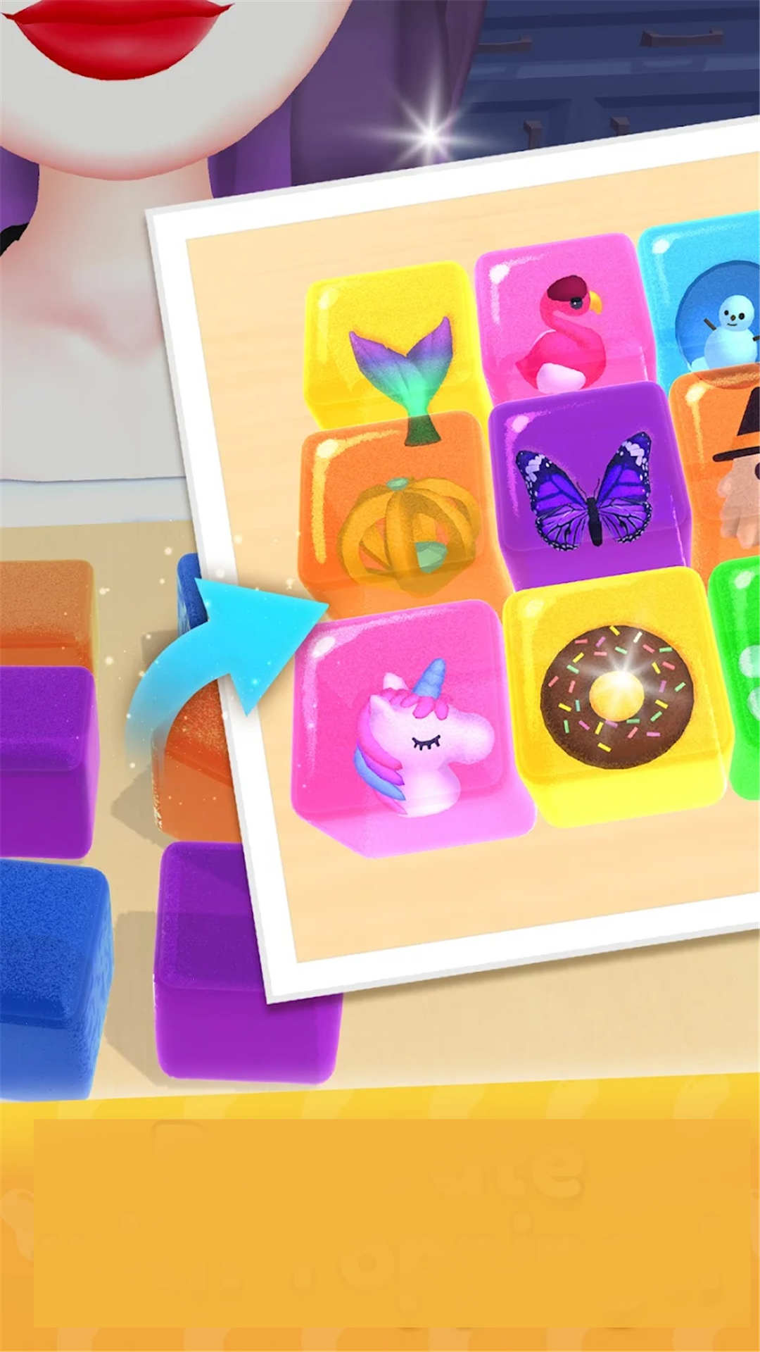 这是一款模拟解压游戏,制作美味的解压果冻,拿起材料制作成五颜六色的果冻软糖,