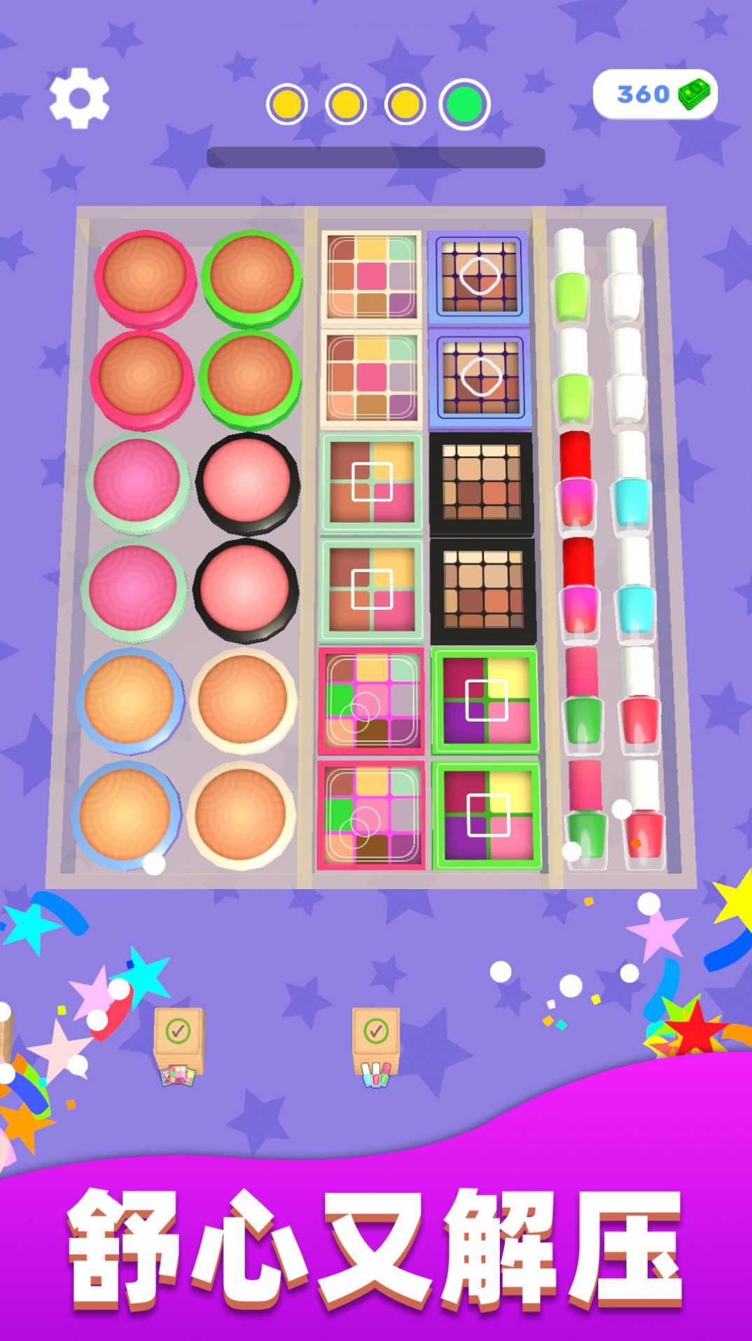 强迫症又犯了游戏是一款有关于整理收纳的人气游戏,休闲收纳的过程非常减压,在有限空间内放下更多物品,这极为考验玩家们的头脑智力,当然这个过程中的操作一点儿也不复杂,真正可以让大众获得满满快乐感,物品类型众多,包含有食物、饮料、冰块等等。