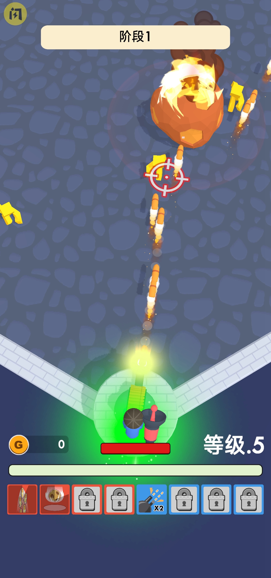 3、当炮的发射抛物线对标敌人后松开按钮,炮弹会 立刻发射飞向瞄准的敌人。