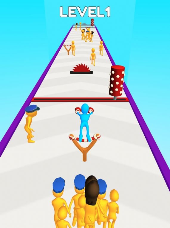 3、躲避追你的人群的恶搞游戏,你可以坐在弹弓上弹射出去,撞击路人。