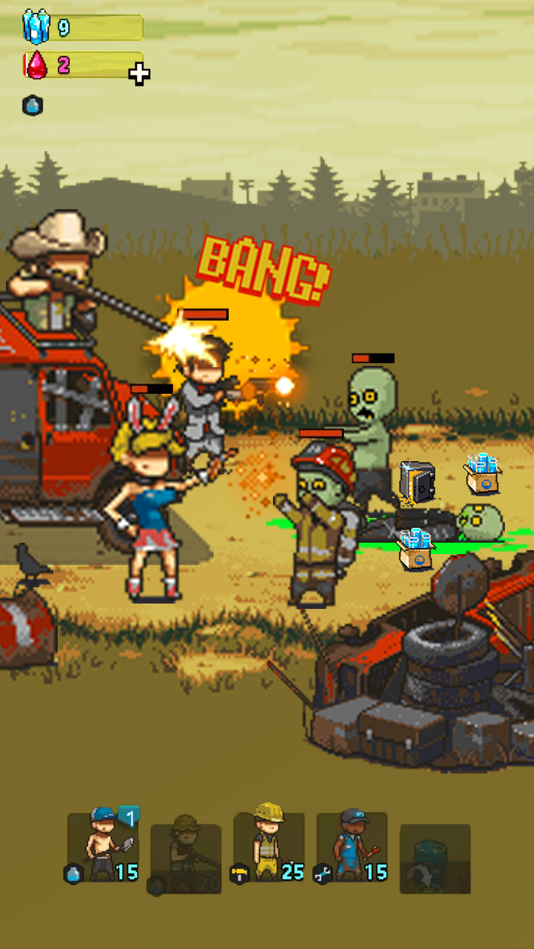 2、召集你的勇士队伍, 派他们去作战,不择一切手段打退渴望吃肉的像素尸群!