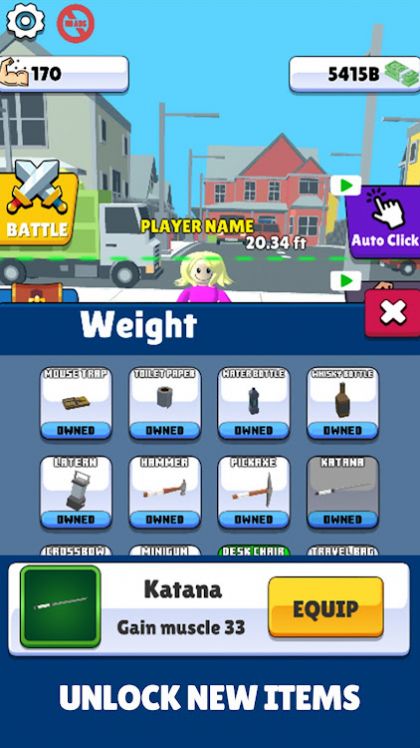 3、从小重量开始,卖掉你获得的肌肉购买新物品并举起更多的重量点击点击。