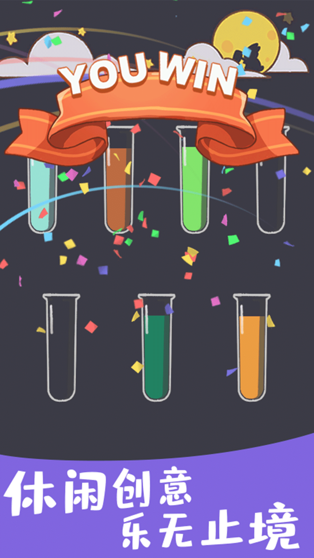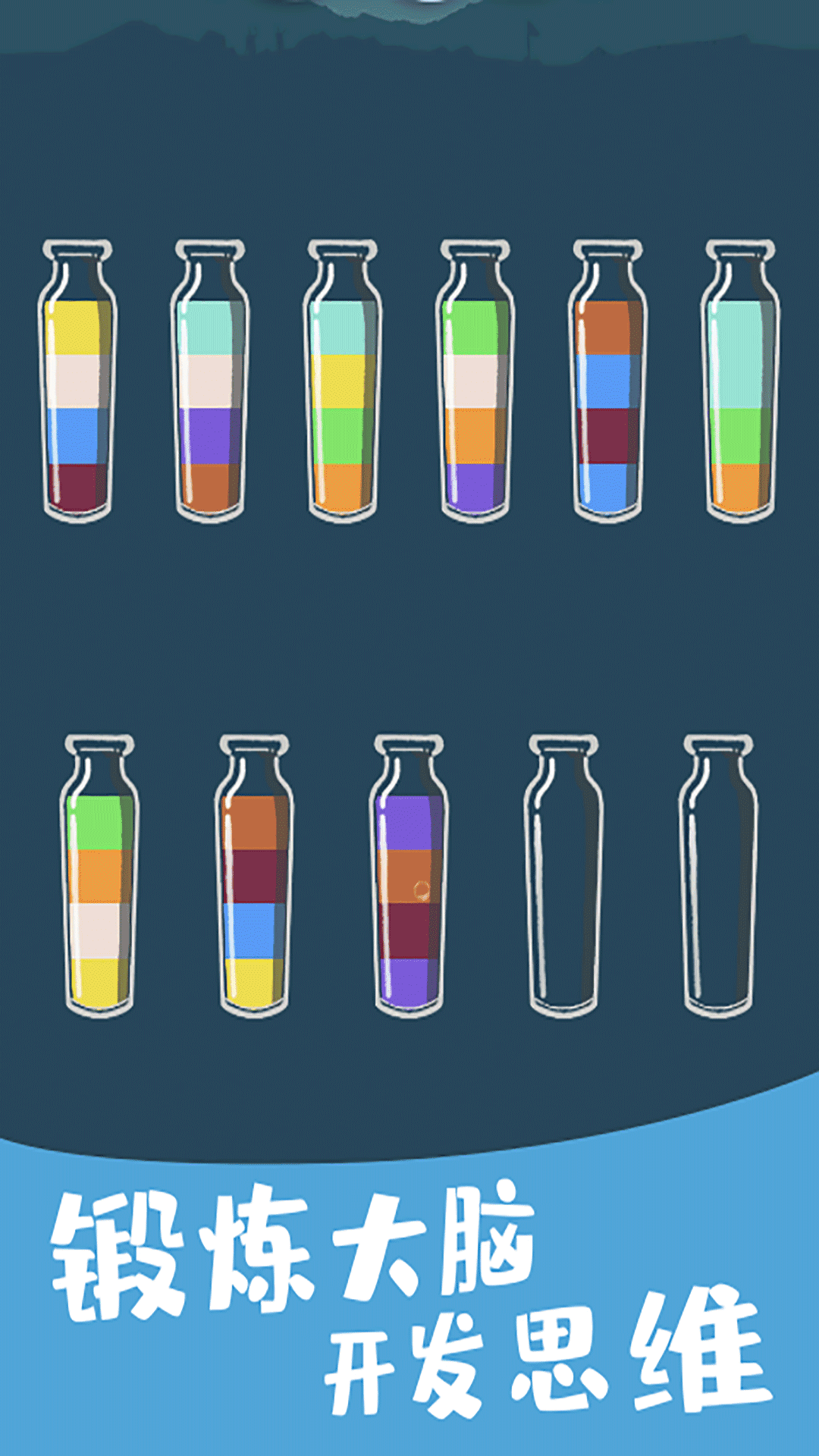 趣味益智的颜色排序游戏,玩法简单,玩家只需要将玻璃杯中的水按照颜色进行排序,让不同颜色的水聚集在同一个玻璃杯中即可过关。