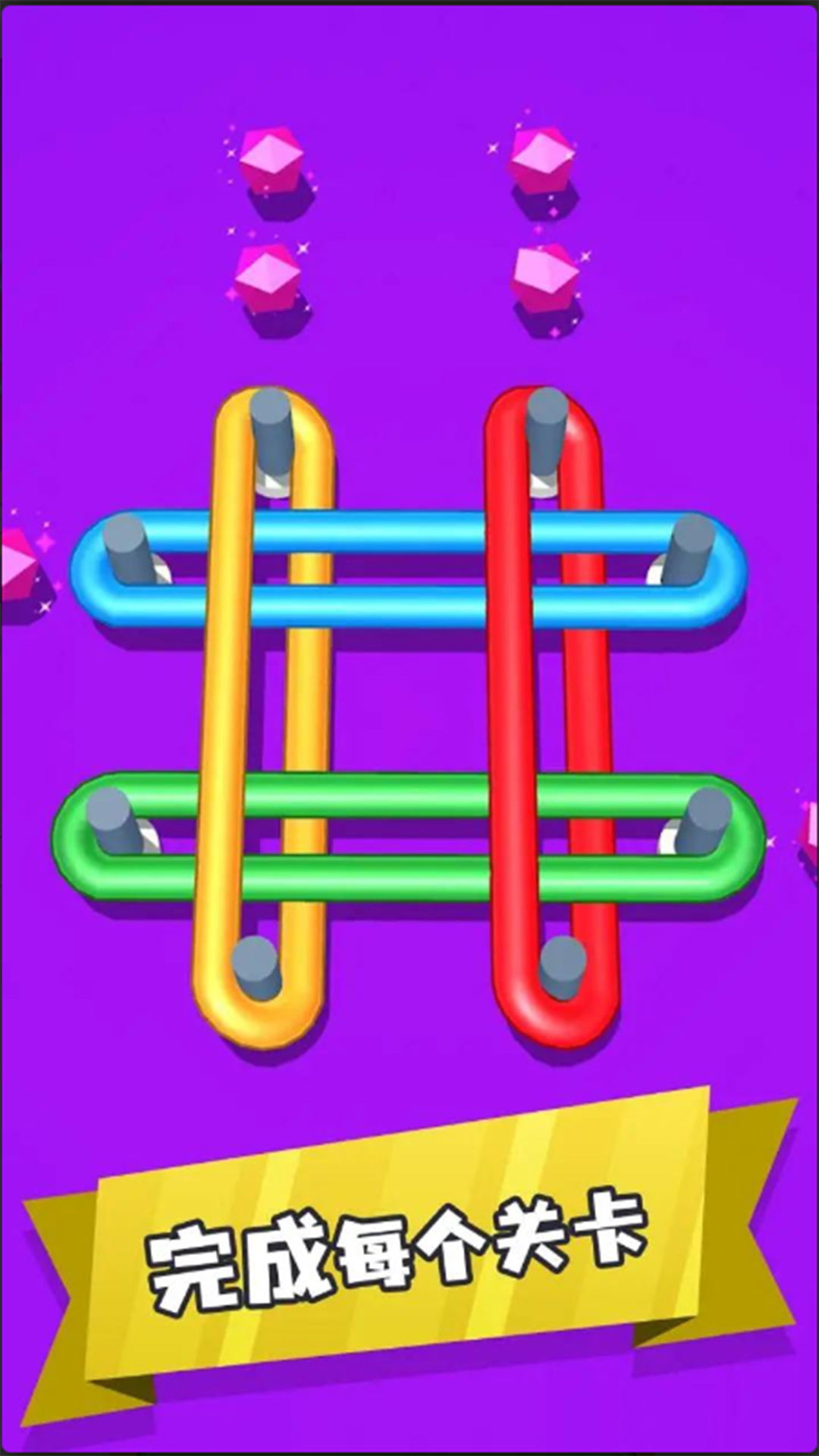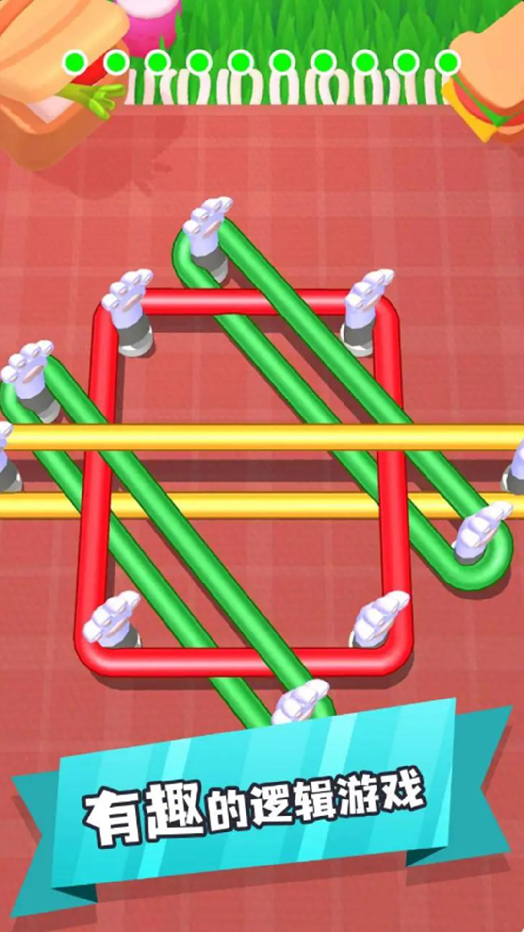 1、将不同颜色的橡皮筋按照不同的顺序将其全部解开,有众多关卡需要解决橡皮筋的问题。