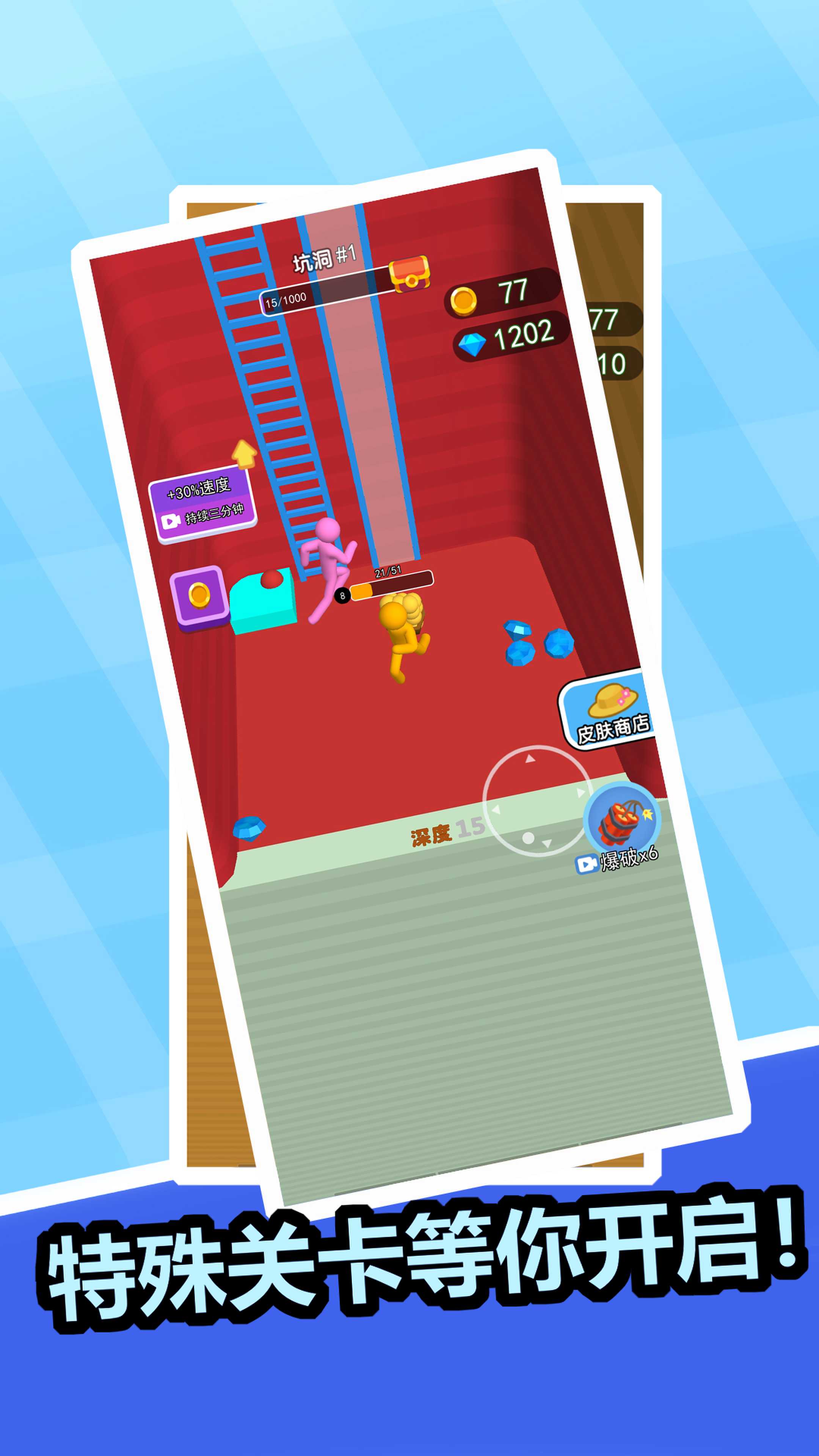 解锁各种版图,雇佣矿工模块,可以获取自己想要的矿工,协助玩家一起挖洞,获得砖石,出售获取利润!