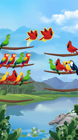 这是一款休闲益智游戏,玩家需要利用空闲的树枝来移动不同的小鸟,把相同相同颜色的小鸟放在一个树枝上直到所有的鸟飞走。