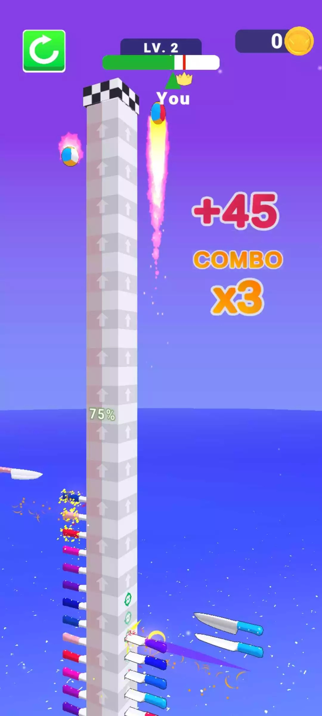 节奏飞刀这是一款超级好玩的飞刀闯关类游戏,控制飞刀在不断射击中扎到墙壁上,使小球作为踏板不断的向上弹跳,期间不能扎破小球,否则任务失败,和好友联机对战,方法多种多样,小球弹射的高度越高,获得的分数越高,解锁的要求越难。