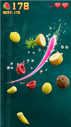 游戏开始后下方会不断弹出各类水果,手指划过他们就可以切成两半获得分数奖励,分数越高,注意不要切到炸弹,切到3次炸弹就会游戏结束。