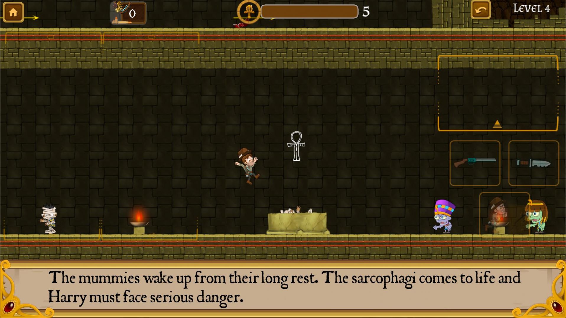 是一款横版益智闯关类游戏,冒险者发现了一座金字塔,现在他进入里面,寻找隐藏了多年的秘密,但是危险也随之而来,他没有退路了,必须寻找要是,击败木乃伊寻找出路。