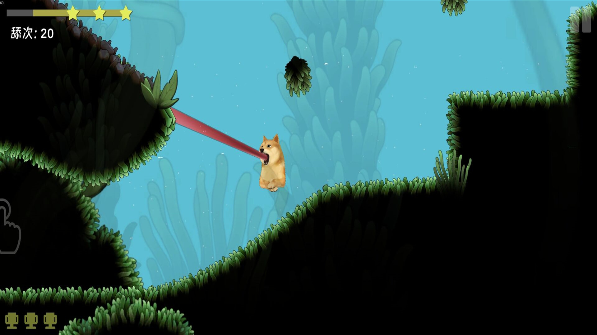 1、控制舔狗舌头的方向,吸附特殊区域进行跳跃,躲避关卡中的陷阱,不断前进,完成关卡挑战。