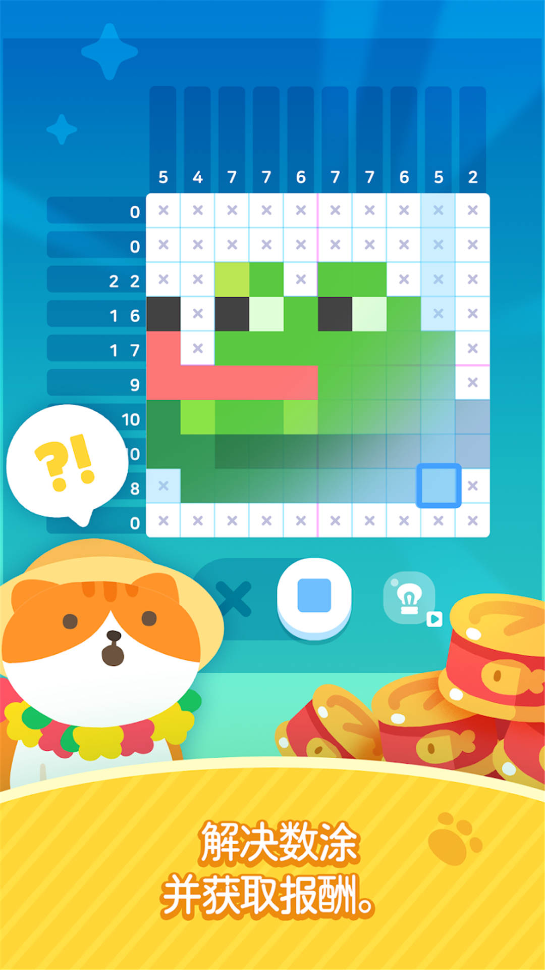 2、游戏中解锁更多的数字谜题,可爱的猫咪角色选择,自由移动猫咪来答题闯关;