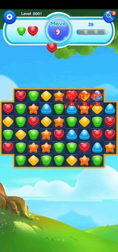 1、拼接三个或以上相同颜色或形状的糖果,触发消除并获得分数;
