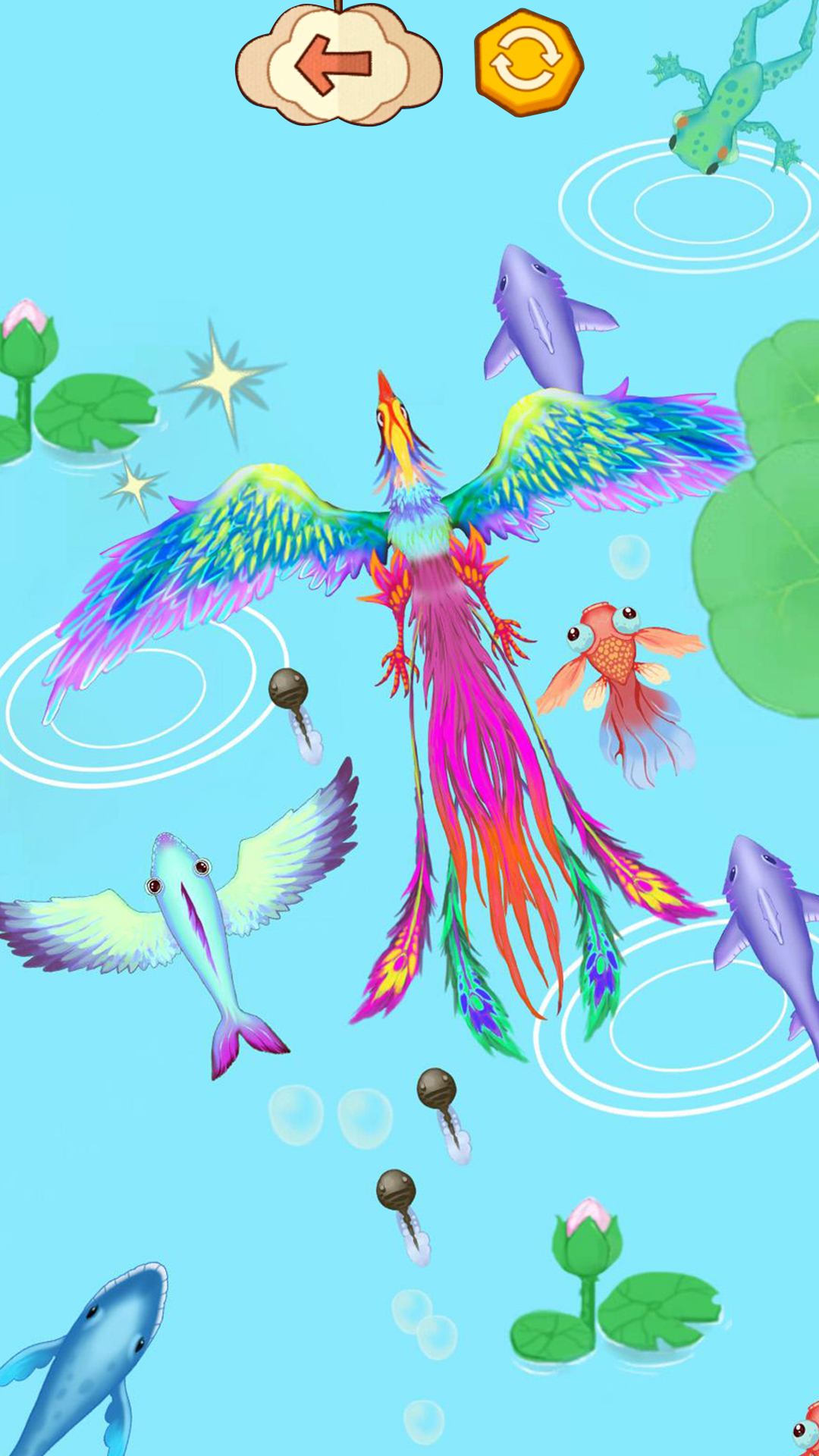 1、根据小鱼在生态圈中的角色变化,选择适合的食物,让小鱼不断成长。