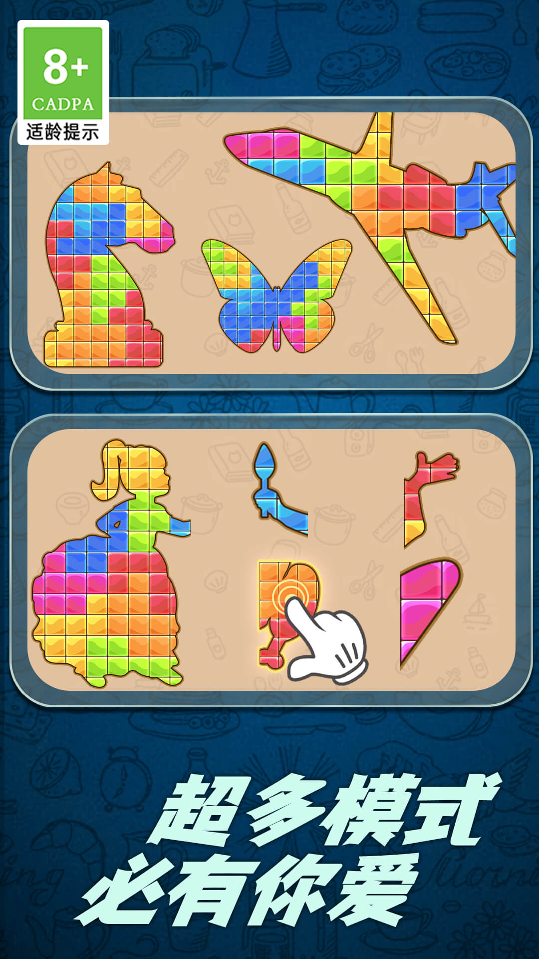 2、将不同的形状拼成一个完整的图案,玩家需要耗费心思和时间来完成拼图。