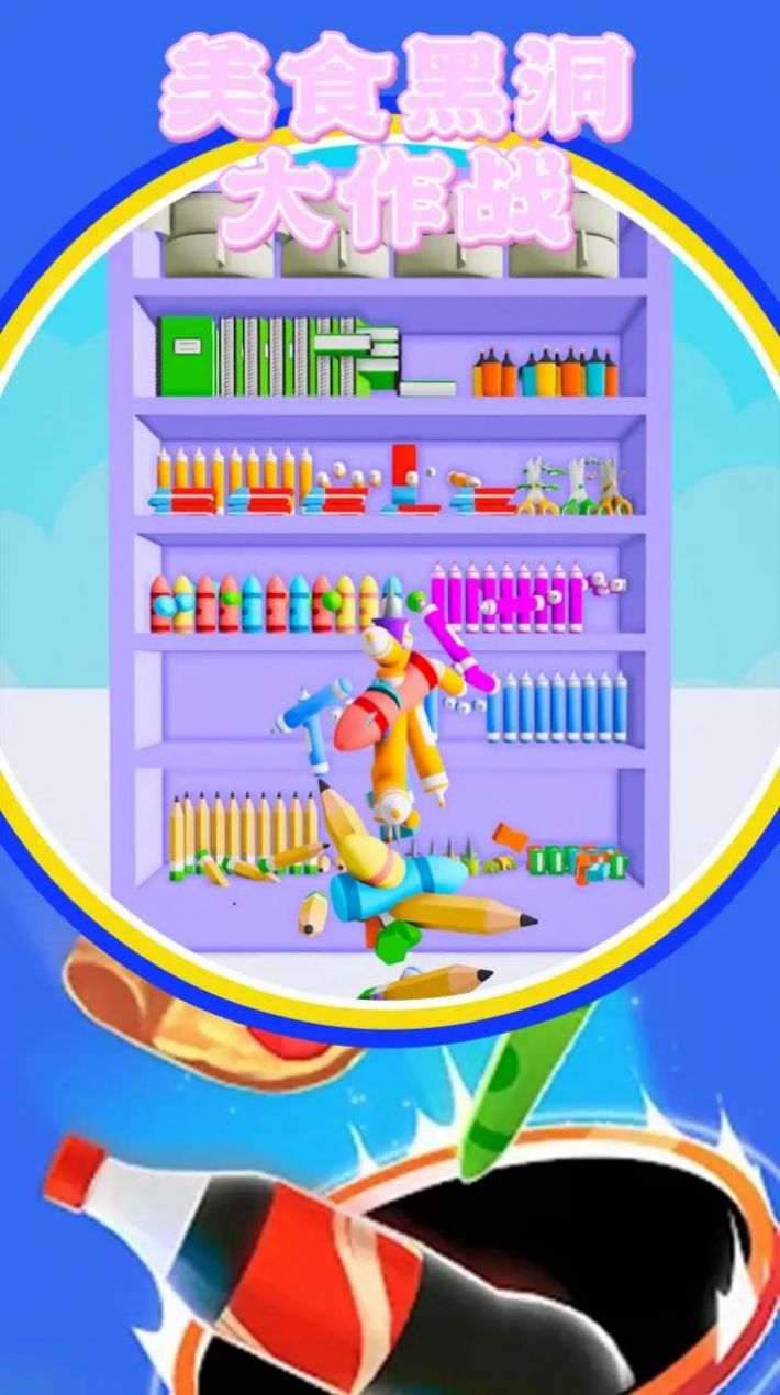 美食黑洞大作战是一款休闲益智类游戏,在游戏中玩家需要控制一个黑洞,不断吞噬各种美食,同时要躲避障碍物和敌人的追击,尽可能吃到更多的食物来增加分数。同时游戏还设有多个关卡和挑战模式,玩家可以根据自己的喜好选择不同的游戏模式进行挑战。