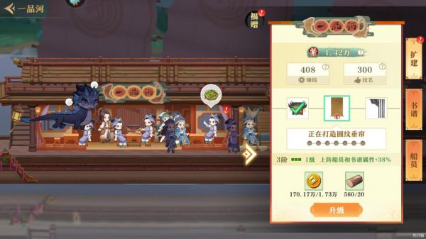 4、获得的奖励可以用于“一品河”扩建,这样可以提升技艺属性,同时还会增加玩家的收益