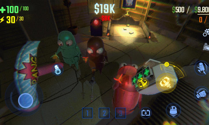 4、点击新游戏后会进入地图,正式开始后左边控制移动,右边是跳跃、蹲下,翻滚按钮。中间下方的123是口袋,可以放入拿到的物品。