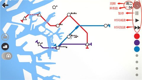 2、地铁换乘枢纽:玩家可以将站点转为换乘枢纽,增大可容纳的乘客量,提升游戏的挑战性和趣味性。