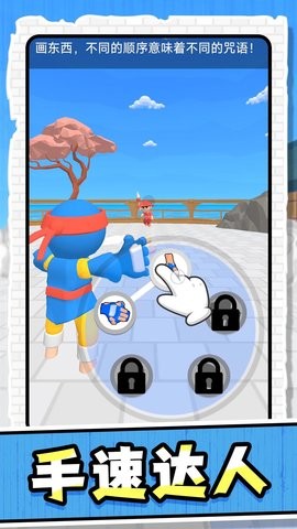 1、迅速点击手势图标,主角画出手势并释放对应忍术,不同手势组合形成不同效果。