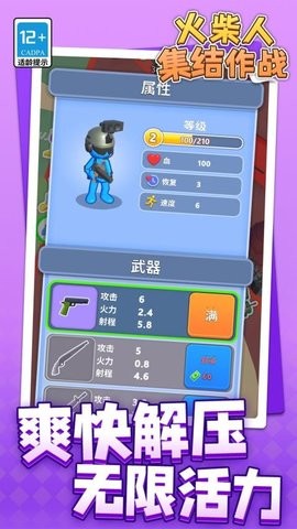 火柴人集结作战是以火柴人为角色的射击小游戏,该游戏有着简约的画风,火柴人们可以集结作战,闯关成功可以获得大额金币,玩家通过操控火柴人消灭大量的敌人,还有许多不同种类的武器可以使用,您可以给武器升级,让角色变得更强大,还可以看见角色剩余的血量和速度。