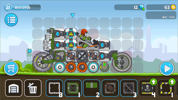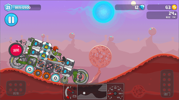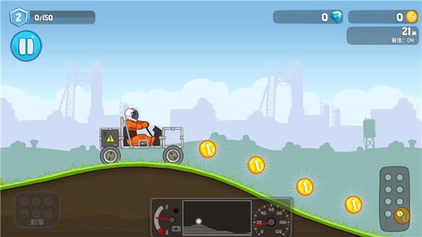 2、拥有了一辆车子之后就能开始比赛了,记住最左边是刹车按键,另外右边是油门,要是发现车头翘起记得及时刹车,车尾翘起就加速,并且需要在汽油耗尽之前抵达终点。