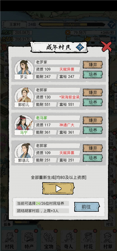 3、将角色进行全方面的提升和养成,还有各种特产、村民、宝物等玩法,带来不同的趣味和体验。