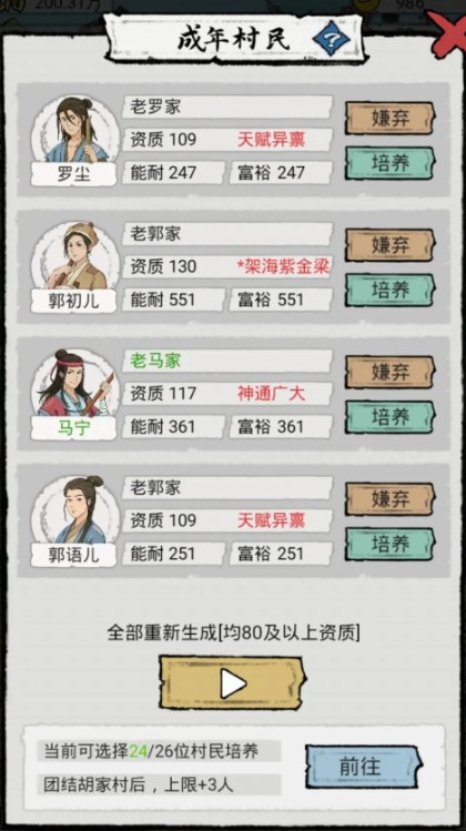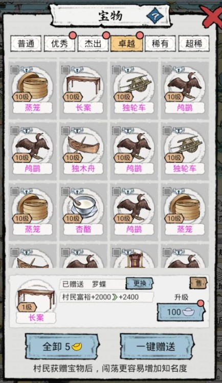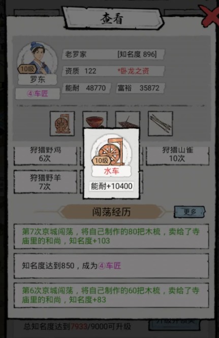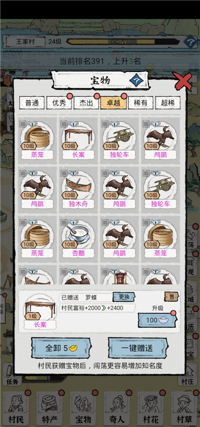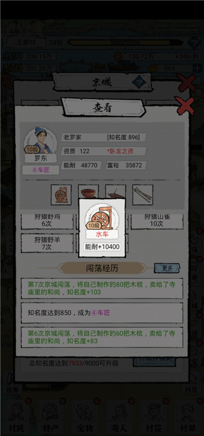 七:村民进京之后,都是把之前身上的装备带走的,我觉得不用卸下来,这些都是加能耐和富裕的,而且每次出门游历,村民都是会随机带装备回来的,带一件装备回来,我就一键赠送,能耐和富裕值一直会加的