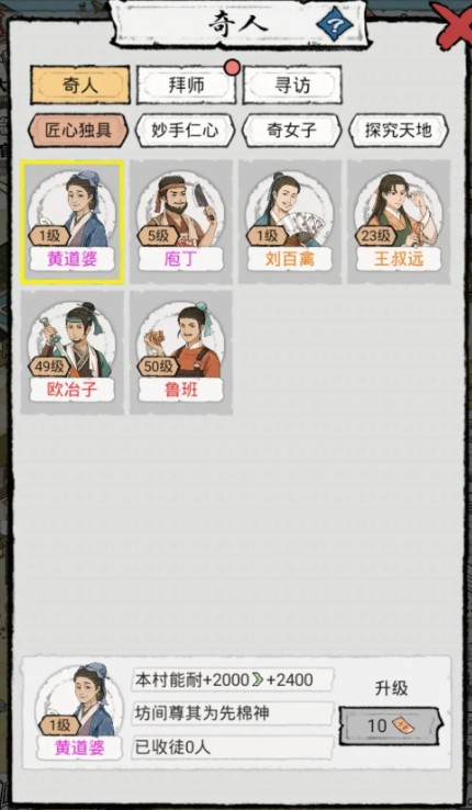 三:奇人:由于金票不够用,我都是优先把红色的人物点满,毕竟加的财富和能耐多。