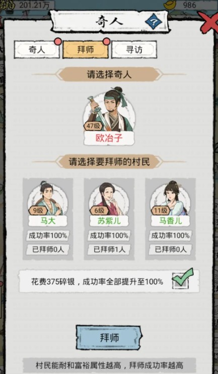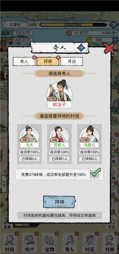 拜师这一栏我都是一个师傅,三个徒弟,徒弟选择成功率50%的,这样下面点?一栏银元宝用的也少;