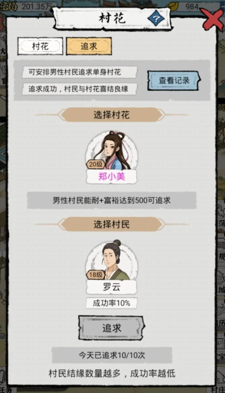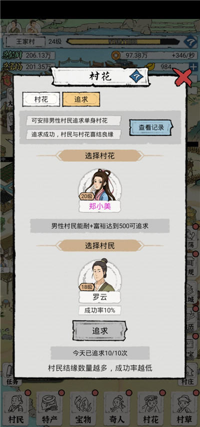 四:村花村草:我目前里面的人物等级都点满了,追求这一块我也不是特懂,我这边的成功率都是10%,基本上追求都是失败,只成功过两次,失败之后就是撮合,我都是选择那个要花金元宝的,而且撮合的对象最好是紫色往上的,这样加的能耐就越高,像绿色的蓝色的最好是放弃掉,毕竟撮合成功一次,后面的成功率就低了