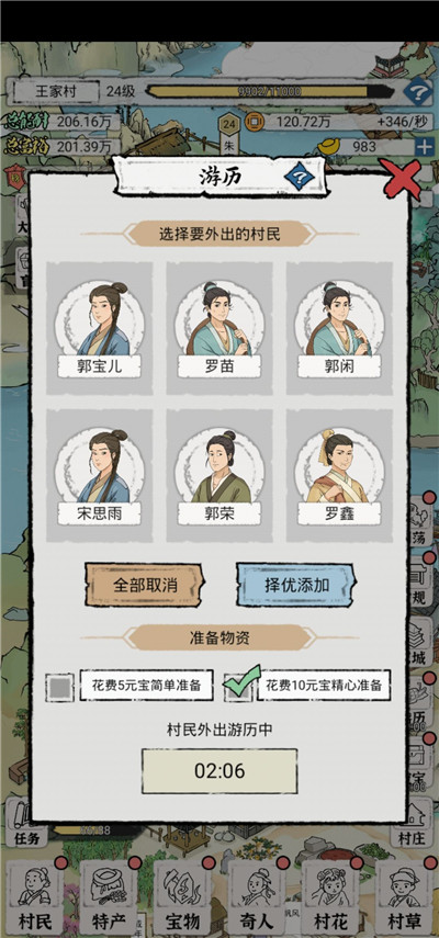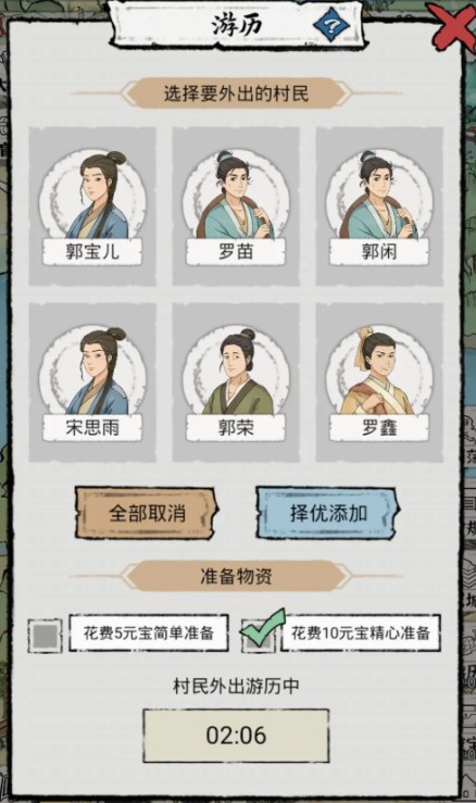 八:游历我都是点择优,打勾这一栏都是选花费10元宝,这样你带回来的东西肯定相对要好一点,装备也多,这样就不怕没有好的装备了。