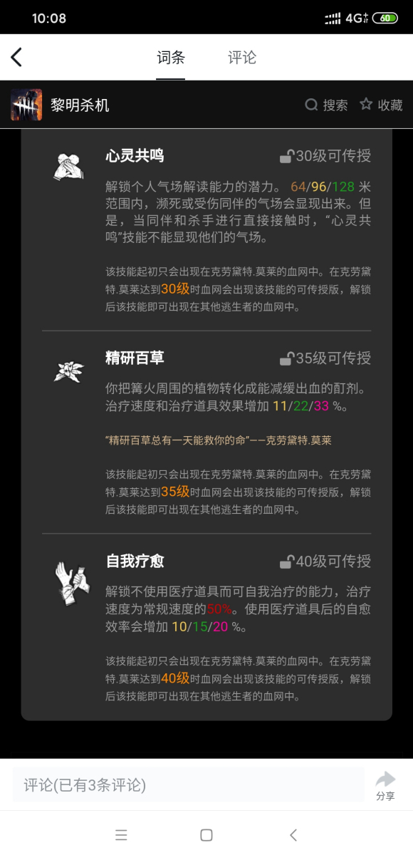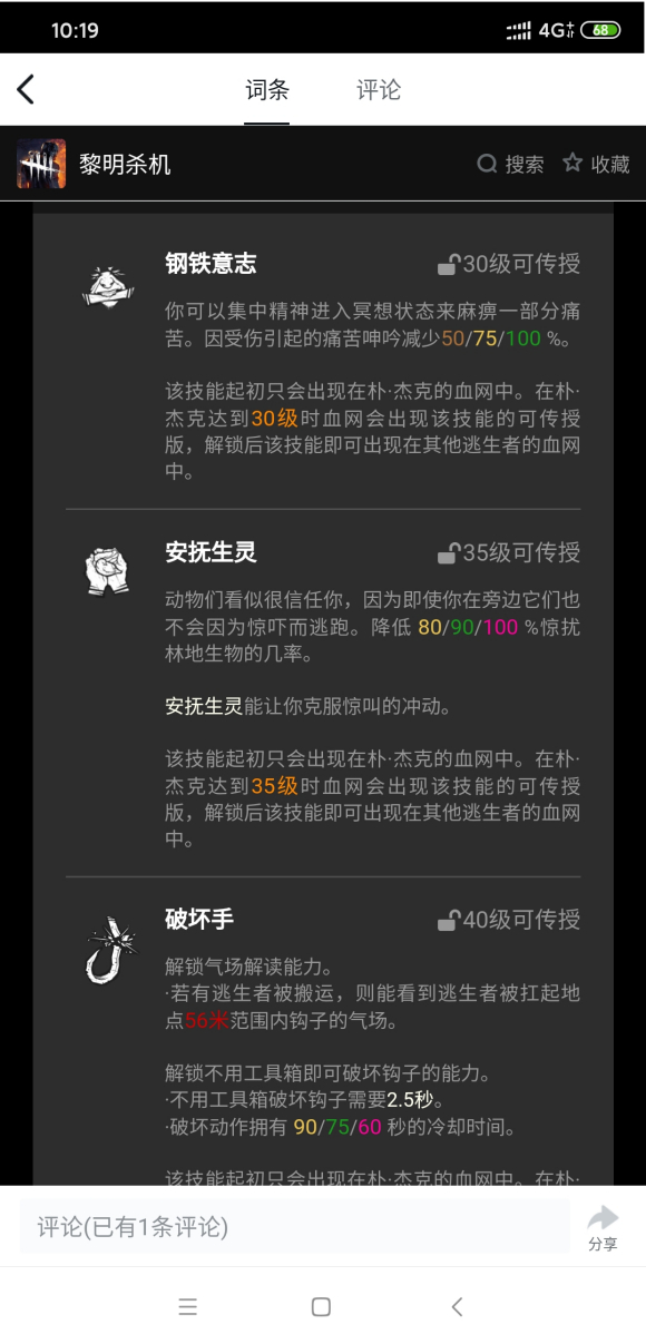 4、关于黎明杀机的技能,由于技能分为四类。人类通用技能,人类传承技能,屠夫通用技能,屠夫传承技能,因此内容较多,新手推荐了解后再调整技能搭配。