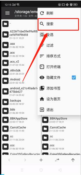 2、打开MT管理器,点击右上角三个点,然后选择搜索,