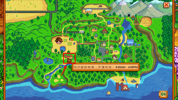3、接下来,在地图上定位玛尔妮农场的位置,它位于自家农场的右下侧附近。