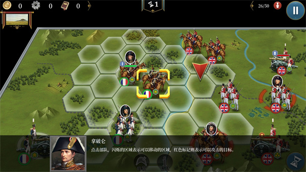 4、点击部队闪烁的区域表示可以移动的区域,红色标记则表示可以攻击的目标;