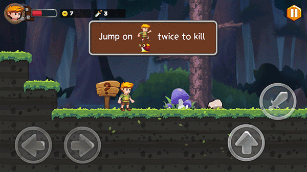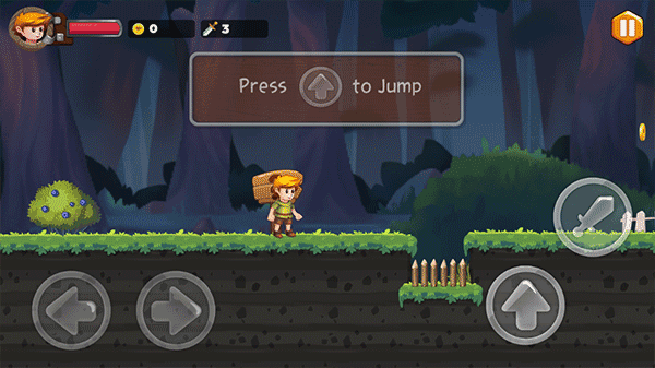 2、经典的操作方式,左下角控制左右方向,右下角跳跃领取金币。如果你拿到武器,发射按钮就会出现。