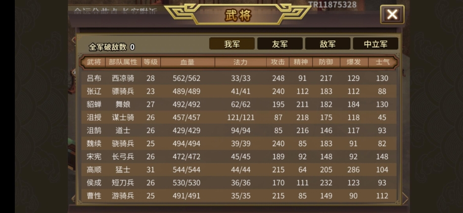 第一回合,貂蝉给吕布加攻。陈宫高顺气和,剩下人如下,貂蝉尽量在回蓝区呆着。上路前面几个回合都不移动,曹仁过来就俩人打曹仁,曹仁死了荀彧会到张辽脸上,sl双击砍死,然后郭嘉也一样。如果打不死貂蝉给张辽加攻。侯成补刀吃药视情况而定。后面就不提上路了。