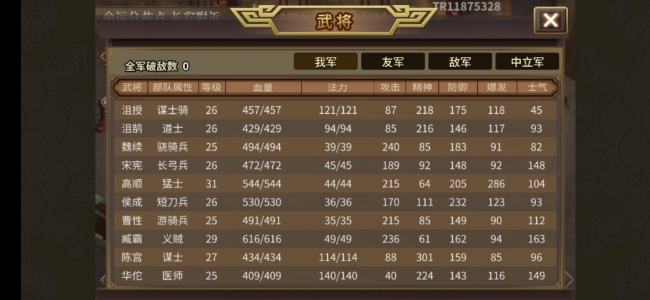 打架前先啰嗦几句:不妨算算自家所有人的等级平均值,这便是敌人小兵的等级,敌人将领的等级会在此基础上再增加一些。要是想让下一关打得轻松点,那么可以把这关过关后的等级平均值控制在14.4以下。毕竟15级的敌人和14级的敌人,差距可不是一般的大。具体做法就是放弃印绶,让吕布直接开溜,我就不信骑着赤兔马的吕布,谁能拦得住。当然,估计大多数人和我一样,性子直,直接干就对了。另外,这个算法仅适用于本周目,后续周目我没算过。