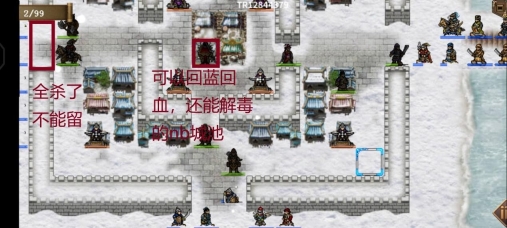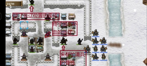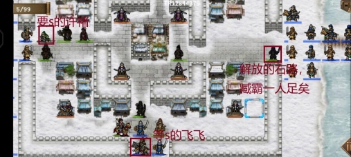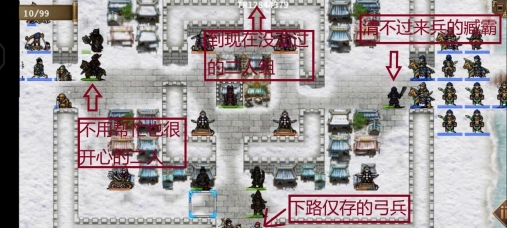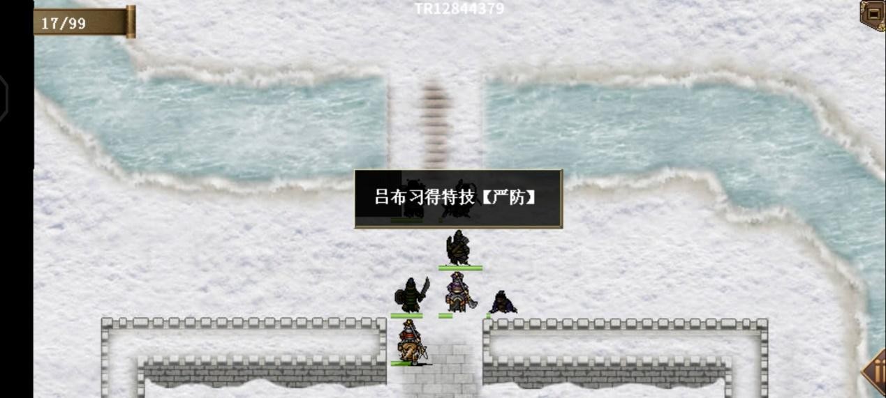 7.其他:左侧的道士可以给臧霸或者高顺带上孟德新书骗技能(谁智力低给谁)。第四回合给吕布加强行,第八回合左右就可以重新加入战场。敌军武术家移动比策士快,策士会脱节很严重,继续往城里打就行,敌军会翻山越岭,一个个来送。