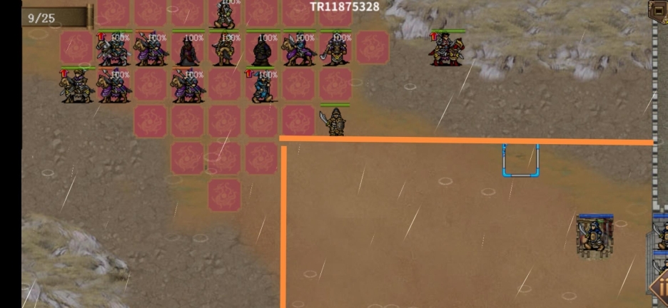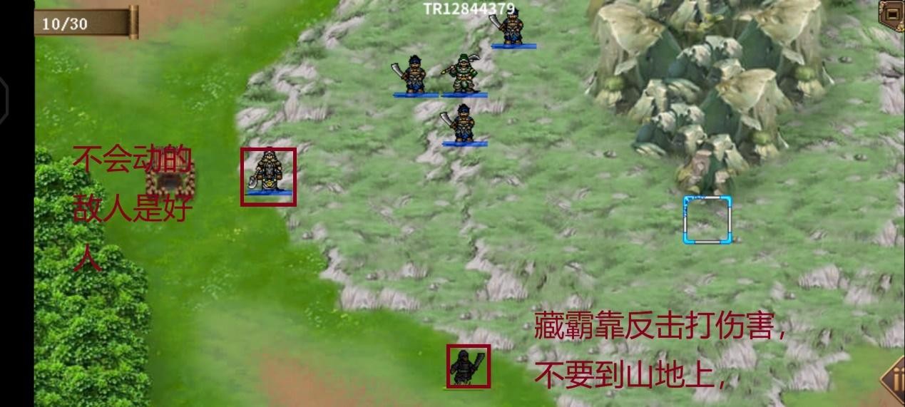 注意事项:多给貂蝉补一下兵,十六关需要15级。敌人有伏兵,九个盗贼,触发条件是我军有人进入(8,19)(19,19)(8,26)(19,26)这个区域,在回合结束时都会触发伏兵。如下图,不要看我血量这么惨,其实都是为了找触发条件搞得。