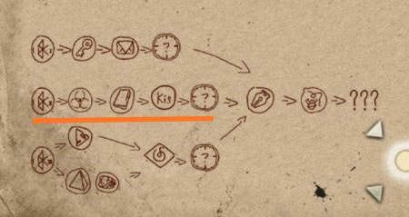 三个谜题在点击开始解谜时在欣赏会给出提示,其中每行的第一个代表着谜题的代号这个符号是迷室系列游戏的代表性符号,每行的最后一个“时钟”则是代表着谜底的意思官方有提示说解开谜题发现的是时间,也就是意味着时钟与第一个符号之间的符号是引导解开谜题的步骤。此时可以开始解谜。