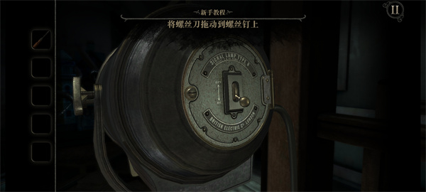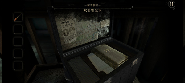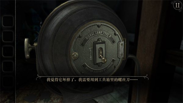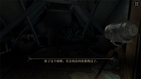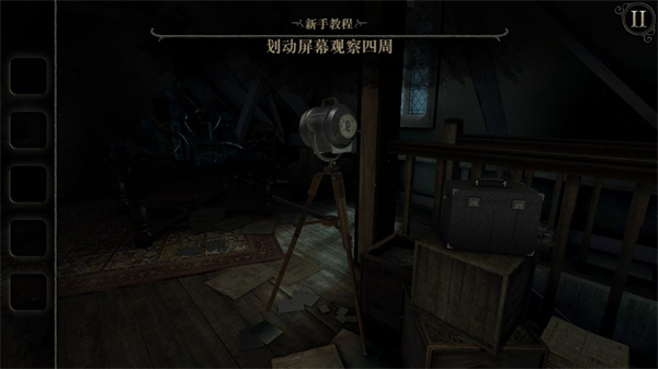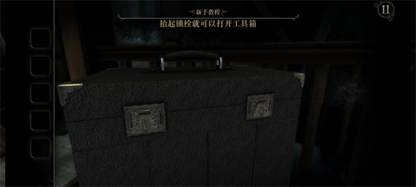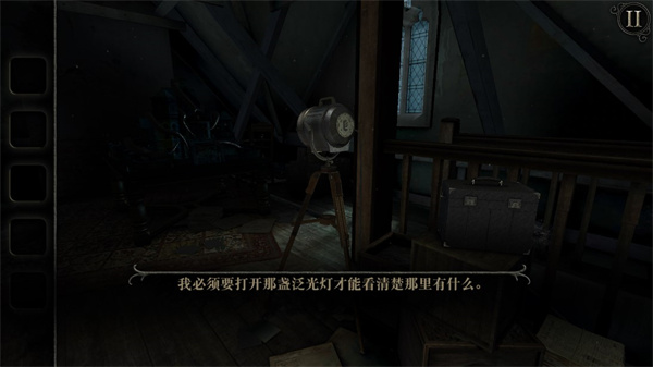 1、这里是沃尔格雷夫庄园阁楼,请根据教程进行操作。检查泛光灯,并扳下打开开关。泛光灯已坏,所以先找到手提箱。打开锁栓和箱盖,获取螺丝刀,翻阅EOS日记。