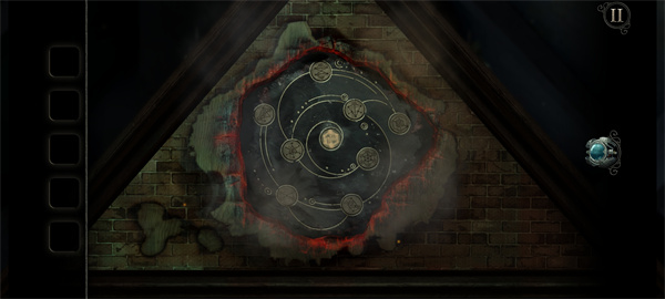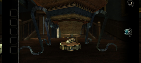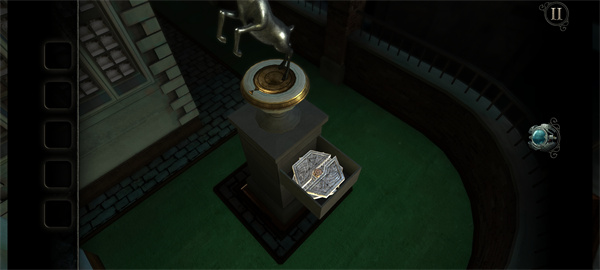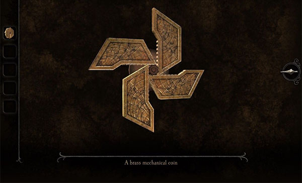 11、回到大厅。像上次那样打开机械硬币。把它放到机关盒的另外一个卡槽里,找到与所示轮廓相吻合的图案。得到一个雕花的金属板。