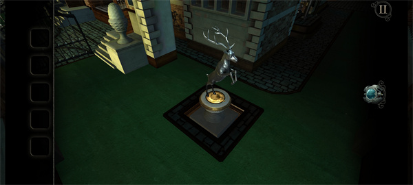 10、这时,两个底座会从玩具屋的地面升起。左边的底座上方是空的,而右边的底座上有一个麋鹿雕像。旋转该雕像的圆形托盘,使托盘上的两个箭头重合。得到另外一个机械硬币。