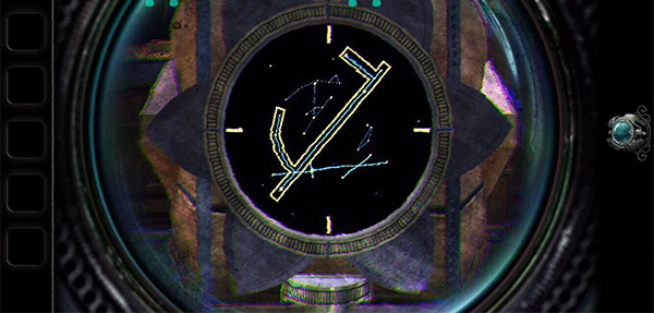 8、将硬币放入机关盒侧面的插槽中,旁边会开启一个圆形镜面,在这个镜面部分使用目镜。转动两个铜色的圆盘找到与所示轮廓相吻合的图案。得到盾牌家族徽章。