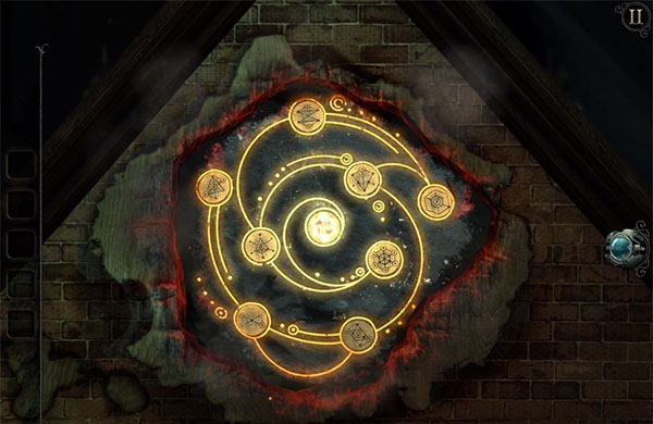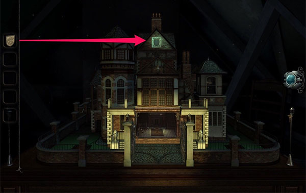 9、缩小画面并退出房间。玩具屋顶部有一个与家族徽章形状相符的插槽。放入家族徽章。随后会出现一些符号,长按中间的符号后,所有的符号将被点亮。