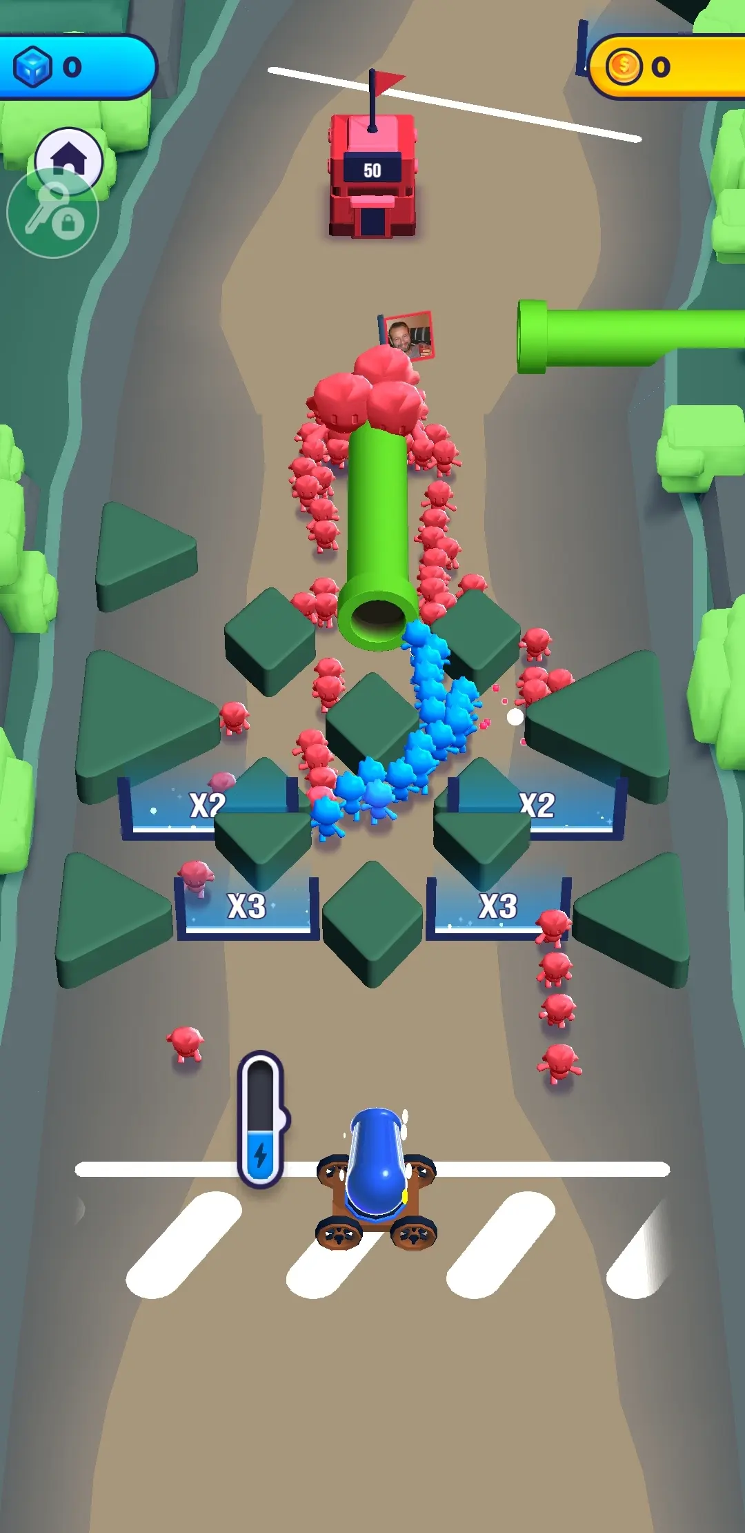 《炮弹人冲冲冲》堪称一款趣味十足的策略闯关佳作。游戏里,玩家操控炮台,发射炮弹兵。当炮弹兵穿过倍数门,其数量便会增多。我们持续扩充炮弹兵队伍,以此抵御敌方炮弹兵的进攻。只要我方在规定人数的情况下成功抵达敌方大本营,就能赢得游戏胜利。小伙伴们,赶紧去攻占对面的基地吧!