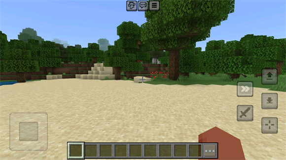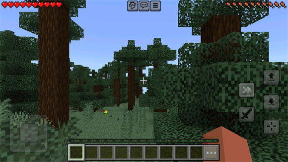 3、进入世界后左边控制角色的移动,右边的按钮控制角色的攻击、采集、制造、奔跑、跳跃、蹲下、瞄准。
